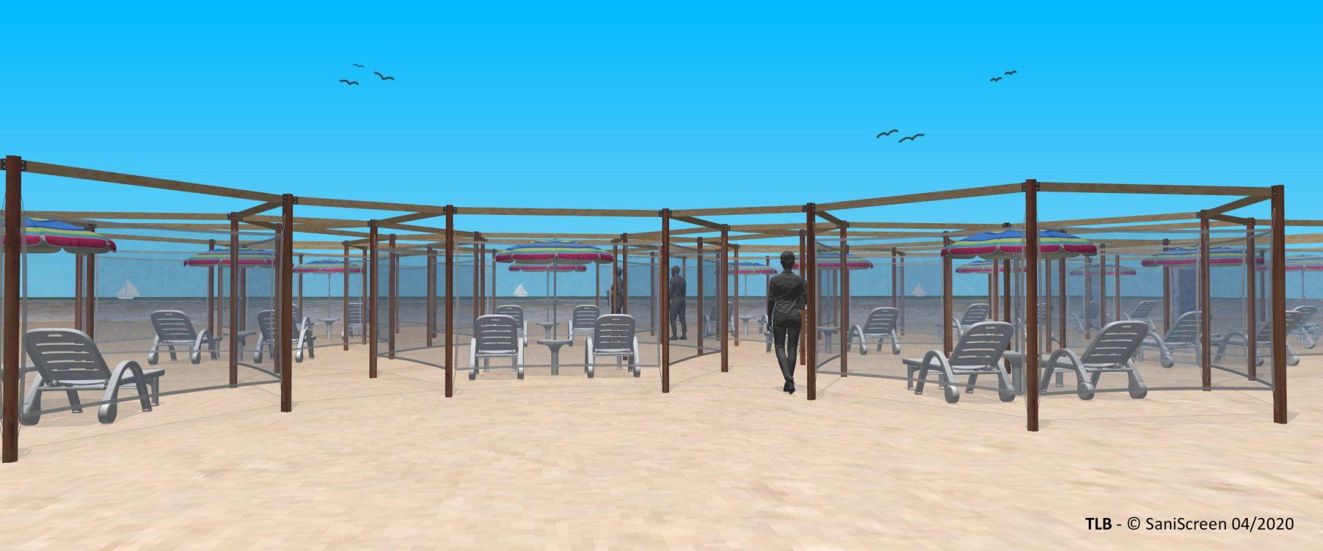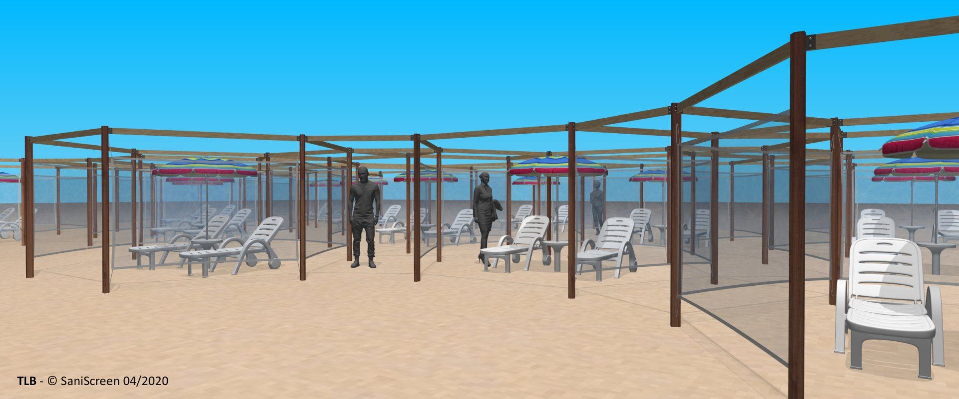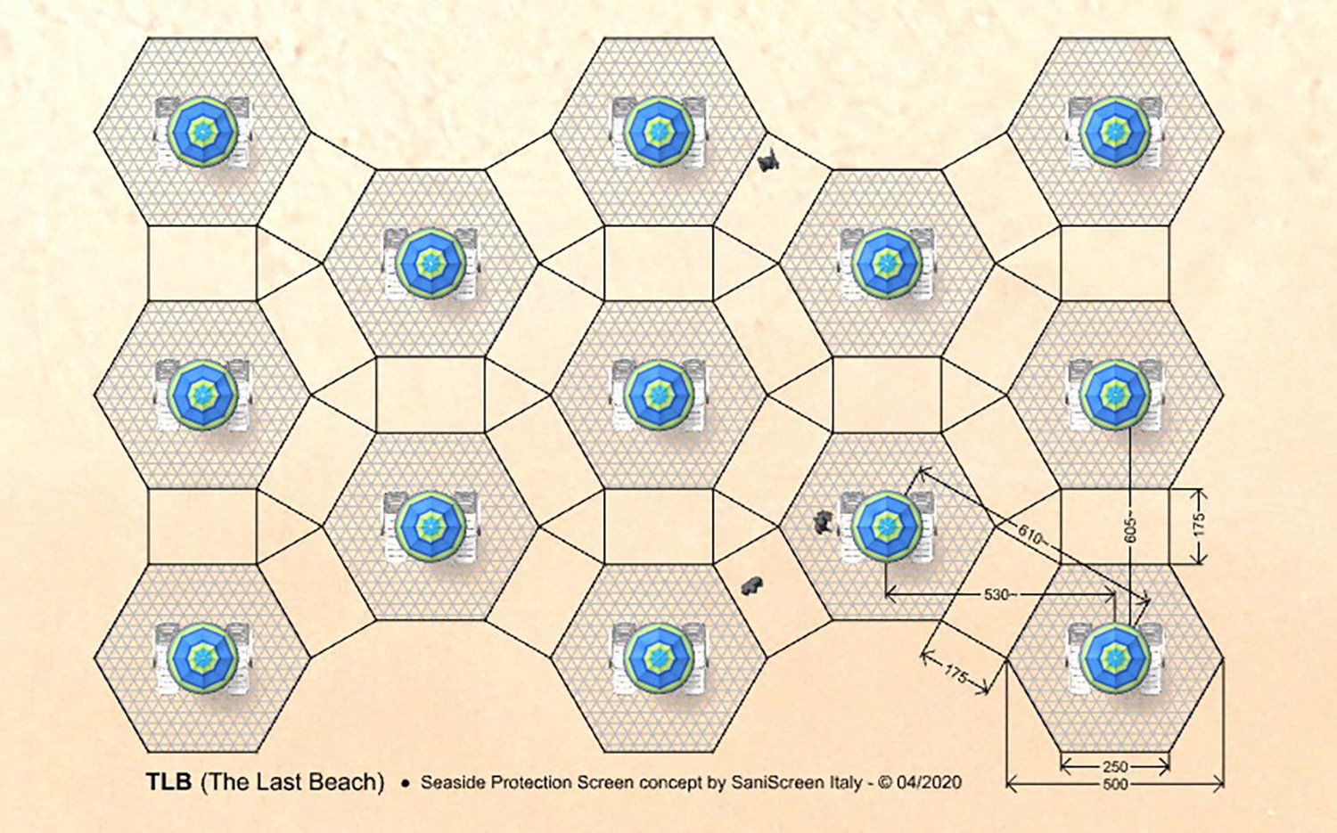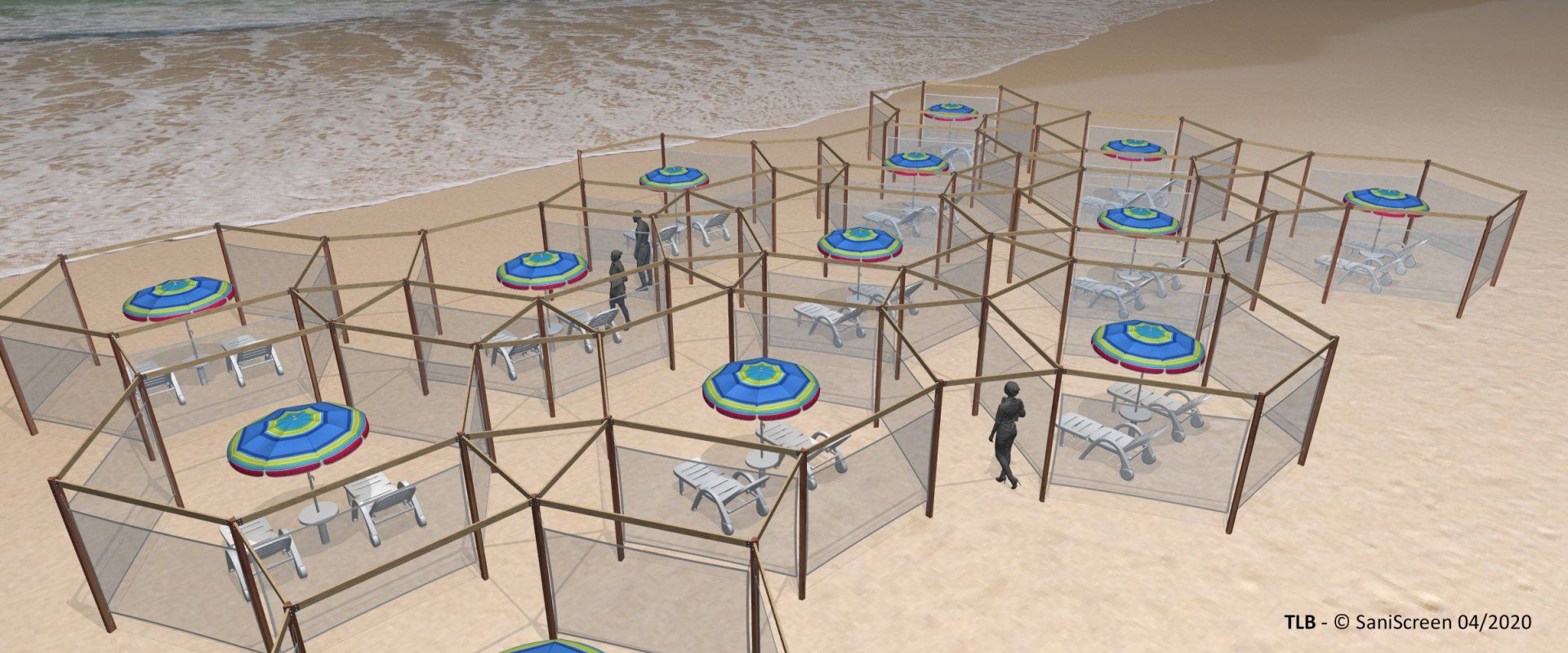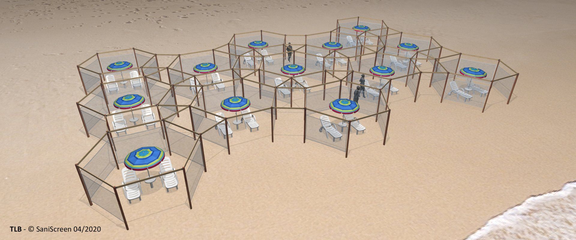 Nell'idea che abbiamo sviluppato, ogni ombrellone è circondato da un perimetro esagonale "di rispetto" in tessuto frangivento (altezza da +30 a +180 cm. con un lato aperto) pensato per ospitare fino a quattro lettini. Il layout a “nido d’ape” consente poi di ricavare una rete interstiziale di percorsi che offrono rapide alternative nel caso di potenziale incontro tra persone che procedono in direzione contrapposta.